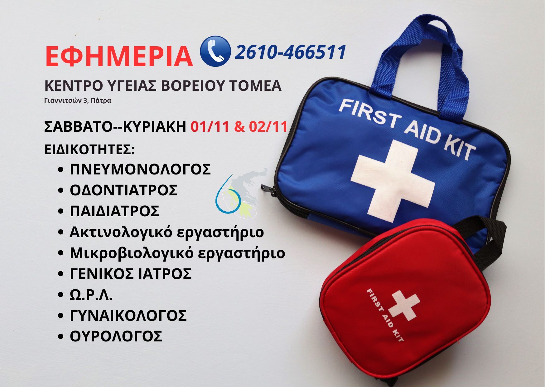 ΕΦΗΜΕΡΙΑ ΣΑΒΒΑΤΟ–ΚΥΡΙΑΚΗ 08 & 09/11/2025 ΕΙΔΙΚΟΤΗΤΕΣ: ΠΝΕΥΜΟΝΟΛΟΓΟΣ ΟΔΟΝΤΙΑΤΡΟΣ ΠΑΙΔΙΑΤΡΟΣ ΑΚΤΙΝΟΛΟΓΙΚΟ ΕΡΓΑΣΤΗΡΙΟ ΜΙΚΡΟΒΙΟΛΟΓΙΚΟ ΕΡΓΑΣΤΗΡΙΟ ΠΑΘΟΛΟΓΟΣ ΓΥΝΑΙΚΟΛΟΓΟΣ ΟΥΡΟΛΟΓΟΣ